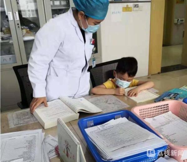 王珂玮说:“每天都在小小的值班室,儿子有时候会闹情绪,今天上午都哭了两次了,说一个人孤独害怕。”虽然很心疼,但她还是把更多的时间和精力放在病人身上,只有在吃饭的时候才挤出时间陪儿子玩。为了让儿子能够安静地待在值班室里,王珂玮也买了语文和数学练习册给儿子做,空闲的时候也会亲自辅导孩子。
