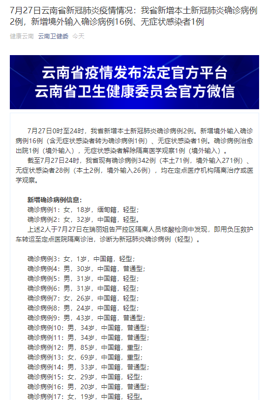 截至7月27日24时,云南省现有确诊病例342例(本土71例,境外输入271例)、无症状感染者28例(本土2例,境外输入26例),均在定点医疗机构隔离治疗或医学观察。