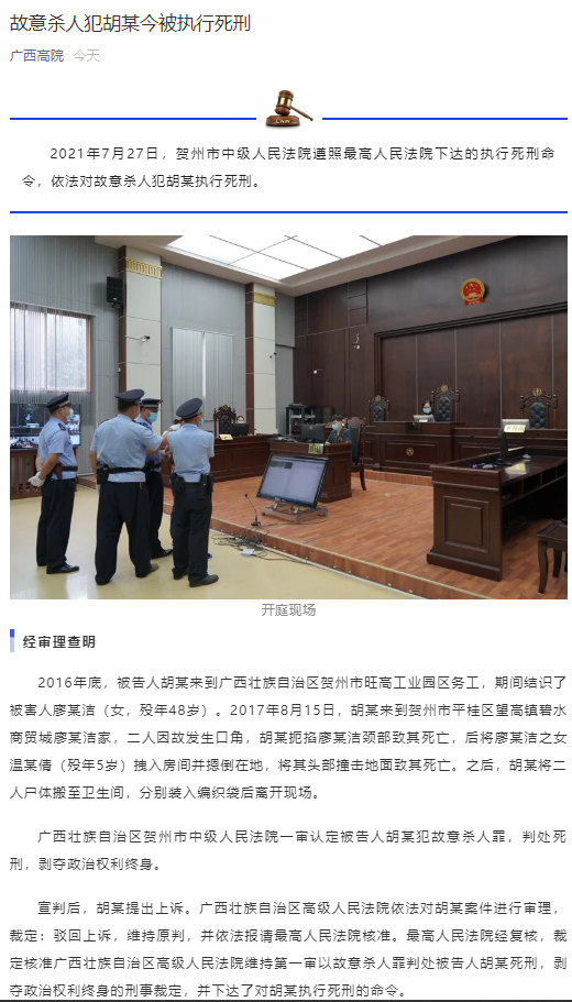 荔枝新闻讯 据“广西高院”微信公众号消息,2021年7月27日,贺州市中级人民法院遵照最高人民法院下达的执行死刑命令,依法对故意杀人犯胡某执行死刑。