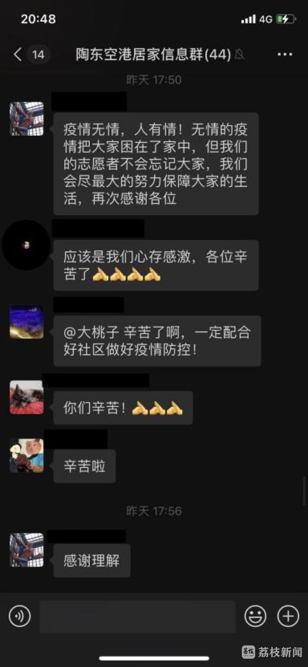除了突发情况,陶东社区的日常保障工作也毫不含糊。社区内永欣新寓百合苑、红豆香江华庭和空港公寓A组团三个小区目前共有117户、279人居家隔离。由于居家隔离人员不能外出采购,为了保证居家隔离人员的“菜篮子”不空,陶东社区工作人员建立了居家隔离微信联络群,隔离人员将需求品发在群中,社区工作人员和志愿者们纷纷做起了“代购”“快递员”“外卖员”,他们热情、及时的服务赢得了居民群众的“五星好评”。