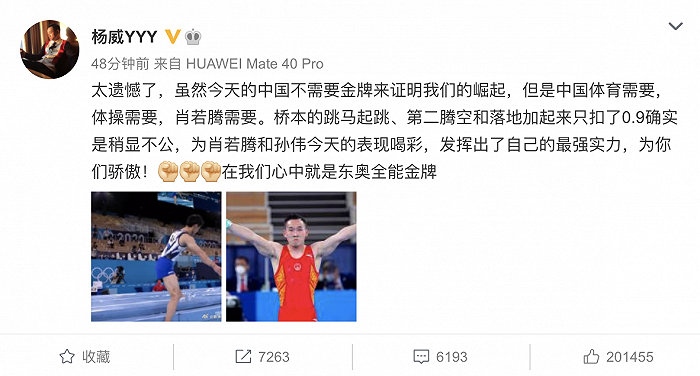 @杨威YYY 微博:桥本的跳马起跳、第二腾空和落地加起来只扣了0.9确实是稍显不公,为肖若腾和孙伟今天的表现喝彩,发挥出了自己的最强实力,为你们骄傲!