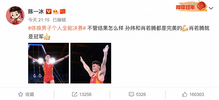 据人民日报客户端7月28日消息,中国选手肖若腾以88.065分,摘得竞技体操男子个人全能银牌。随后,杨威、李小鹏、陈一冰、邹凯在微博发文。
