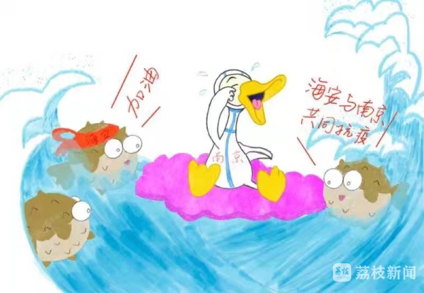 “麻辣小龙虾来了,盐水鸭挺住!”钟莹同学在老家湖南长沙过暑假,她用这样一幅画为南京加油打气。画中描绘了一只生病的盐水鸭躺在病床上,但它并不孤独,窗外有麻辣小龙虾、臭豆腐等一起为它加油。“南京加油!”“我们都在!”简简单单的两句话,却是此刻无数南财学子心中对南京这座城市的真切鼓舞。
