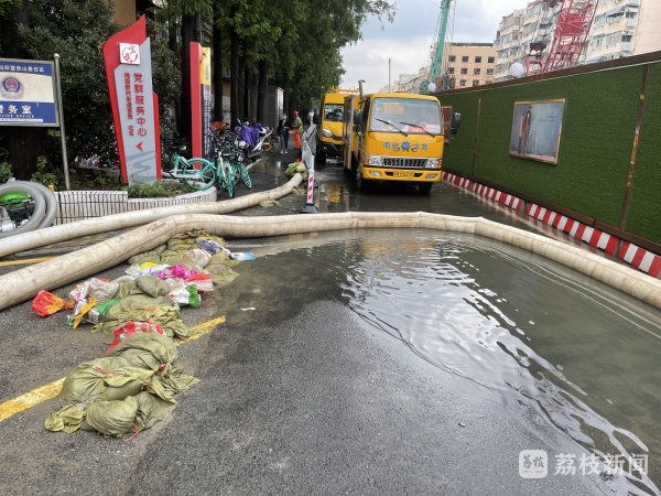 汛情就是命令,南京玄武区梅园街道办事处城管,紧急抽调人员和物资沙袋,垒起防洪水坝同,架设水泵排水,确保居民的正常生活。