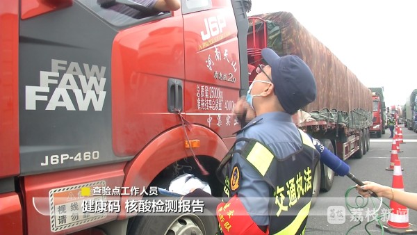 现场,一辆外地牌照的大货车停车后,执法人员提示驾驶员出示健康码及核酸检测报告。而驾驶员表示,自己只是过境车,并没有进入过南京市区。执法人员查验了驾驶员的手机行程码,其信息与驾驶员所说相符,在确认了驾驶员的健康码为绿码之后,执法人员随即将车辆放行。