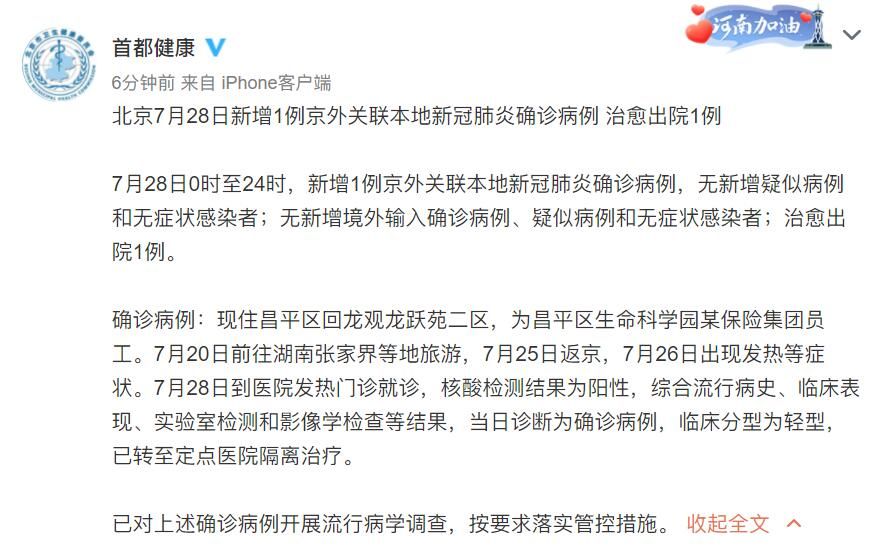 荔枝新闻讯 据北京市卫生健康委员会官方微博消息,7月28日0时至24时,北京新增1例京外关联本地新冠肺炎确诊病例,无新增疑似病例和无症状感染者;无新增境外输入确诊病例、疑似病例和无症状感染者;治愈出院1例。