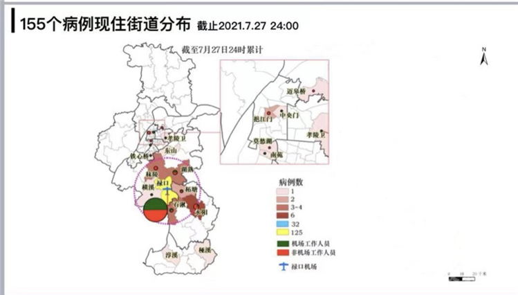 发布会上,南京市卫健委副主任杨大锁公布了病例轨迹和现住址图。截至7月27日24时,155个病例现住址主要分布在禄口街道附近。从病例轨迹热点和现住址来看,主要集中在江宁区和南京主城区两块。这也提醒着疫情防控要从严、从紧。
