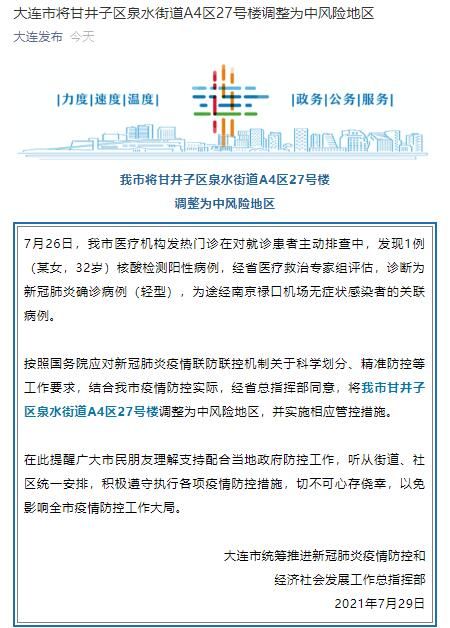 按照国务院应对新冠肺炎疫情联防联控机制关于科学划分、精准防控等工作要求,结合大连市疫情防控实际,经辽宁省总指挥部同意,大连市甘井子区泉水街道A4区27号楼调整为中风险地区,并实施相应管控措施。