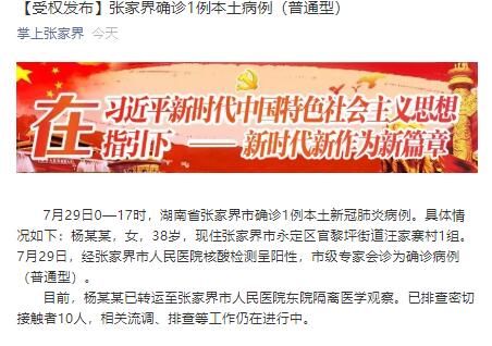 荔枝新闻讯 据“掌上张家界”微信号消息,7月29日0—17时,湖南省张家界市确诊1例本土新冠肺炎病例。具体情况如下:杨某某,女,38岁,现住张家界市永定区官黎坪街道汪家寨村1组。7月29日,经张家界市人民医院核酸检测呈阳性,市级专家会诊为确诊病例(普通型)。