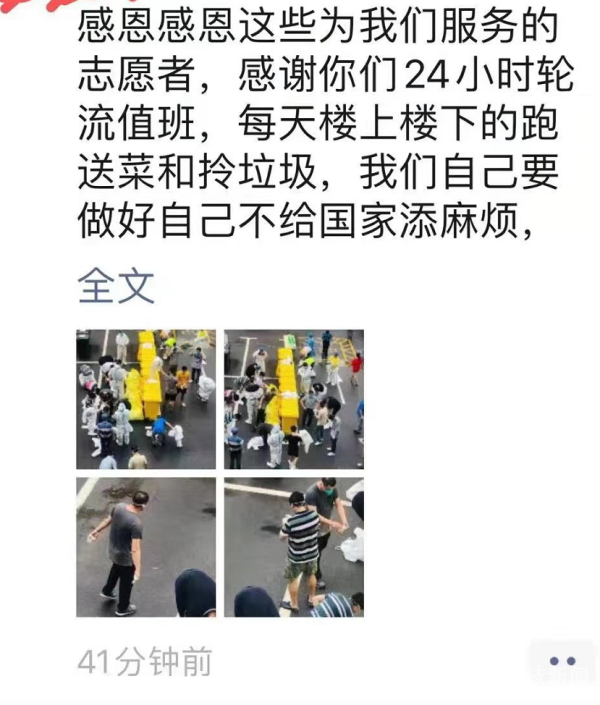 思园小区封控后,贴心的故事一直在上演。在高温下,志愿者们穿着不知道里外湿透多少回的防护服,拎着几十斤的菜楼上楼下地送,帮助居民处理日常生活垃圾;遭遇暴雨天气,却依旧守候在居民楼下,风雨中依然坚守岗位......这些都被隔离的居民们看在眼里。