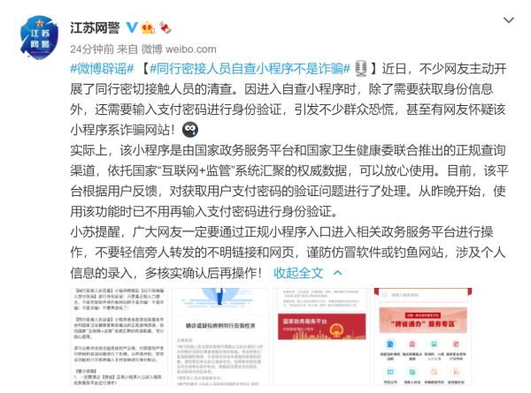 江苏网警今天通过官方微博辟谣:实际上,该小程序是由国家政务服务平台和国家卫生健康委联合推出的正规查询渠道,依托国家“互联网+监管”系统汇聚的权威数据,可以放心使用。目前,该平台根据用户反馈,对获取用户支付密码的验证问题进行了处理。从昨晚(7.28)开始,使用该功能时已不用再输入支付密码进行身份验证。