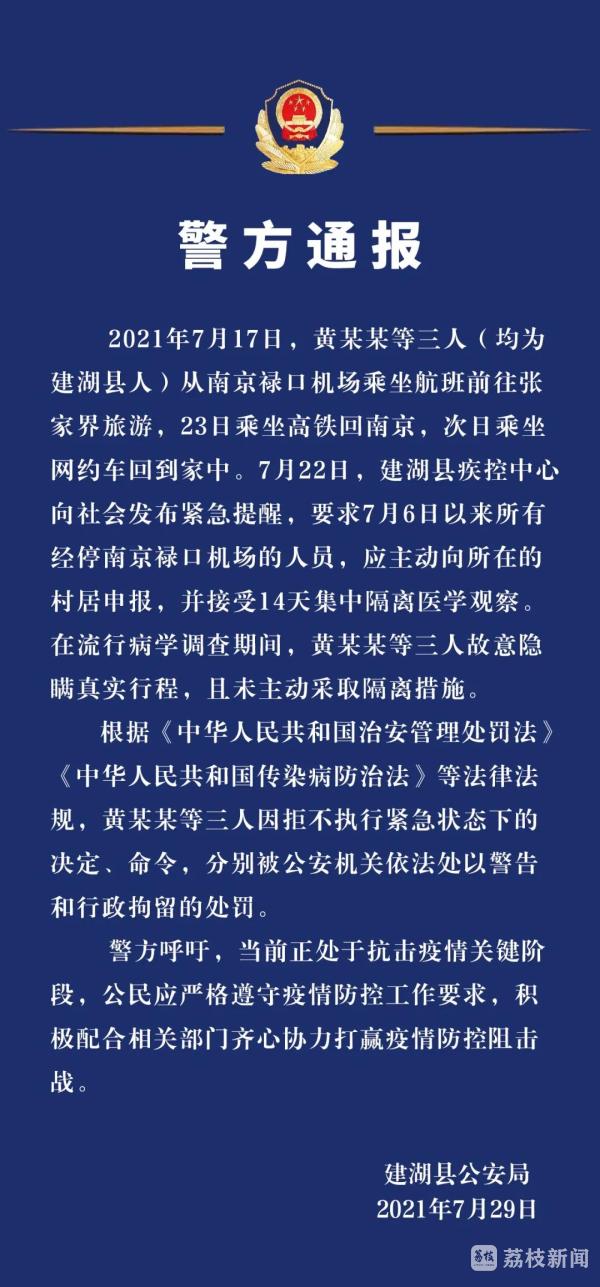 盐城建湖警方今天(7.29)发布通报,黄某某等3人从南京禄口国际机场去张家界游玩,回到建湖后故意隐瞒行程,也未主动隔离,被依法给予行政处罚。