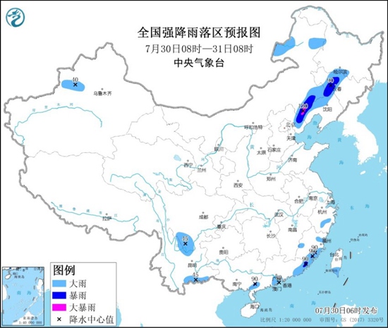 预计,7月30日8时至31日8时,河北东北部、内蒙古东南部和东北部、辽宁西部和北部、吉林西部、黑龙江中部偏南等地的部分地区有大到暴雨。其中,辽宁西部等地的局部地区有大暴雨(100~120毫米)。此外,浙江东部、福建中东部、广东南部、四川南部、云南南部和北部、新疆伊犁河谷等地局地有大雨或暴雨。上述部分地区伴有短时强降水(最大小时降雨量20~40毫米,局地可超过60毫米),局地有雷暴大风等强对流天气。