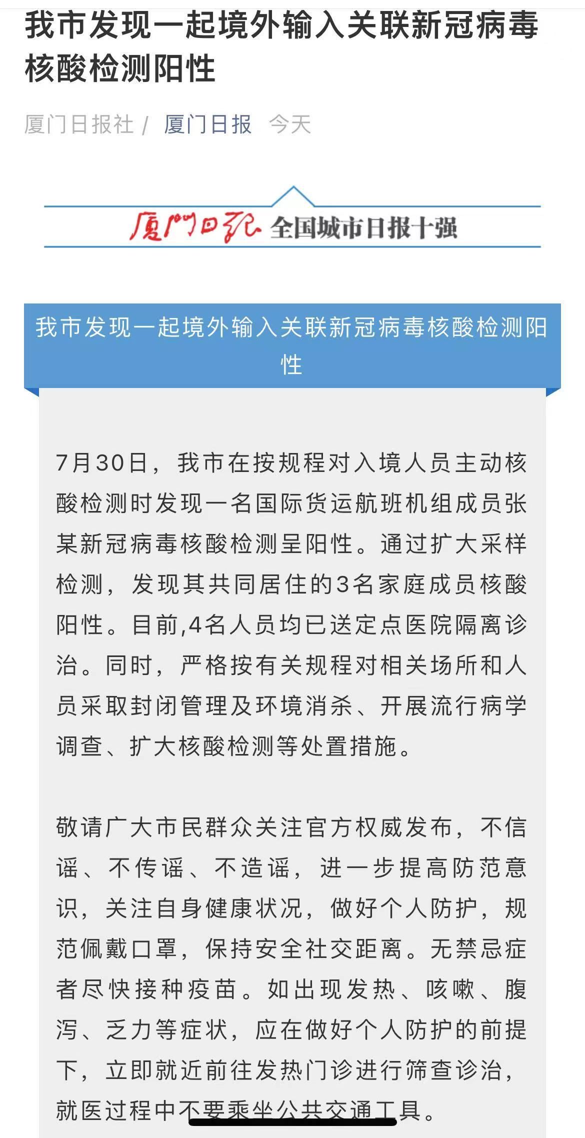 荔枝新闻讯 据厦门日报微信公众号消息,7月30日,厦门市在按规程对入境人员主动核酸检测时发现一名国际货运航班机组成员张某新冠病毒核酸检测呈阳性。通过扩大采样检测,发现其共同居住的3名家庭成员核酸阳性。目前,4名人员均已送定点医院隔离诊治。同时,严格按有关规程对相关场所和人员采取封闭管理及环境消杀、开展流行病学调查、扩大核酸检测等处置措施。