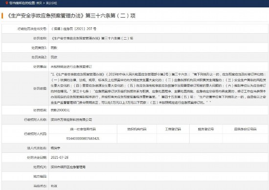 深圳信用网显示,28日,深圳市福田区应急管理局作出处罚决定,对深圳万普拉斯罚款2.9万元,处罚名称为“《生产安全事故应急预案管理办法》第三十六条第(二)项 ”,处罚事由为“未按照规定进行应急预案修订”。