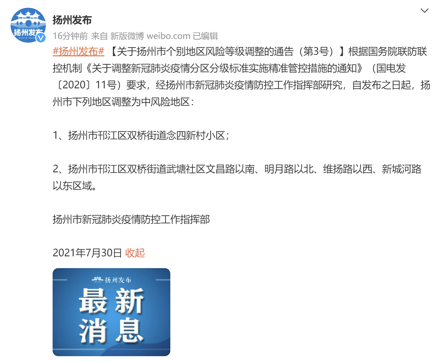 据扬州发布官方微博消息,根据国务院联防联控机制《关于调整新冠肺炎疫情分区分级标准实施精准管控措施的通知》(国电发〔2020〕11号)要求,经扬州市新冠肺炎疫情防控工作指挥部研究,自发布之日起,扬州市下列地区调整为中风险地区: