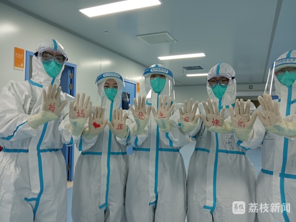 “妈妈❤️祝您生日快乐!”7月30日凌晨3点,南京市公共卫生医疗中心病房护士站前,5名穿着防护服的医护人员伸出写着这几个字的双手,在首次进舱前这样合影留念。他们是江苏省人民医院(南京医科大学第一附属医院)在南京市第二医院汤山院区救治新冠肺炎患者的医疗队队员,之所以拍这样一张照片,是因为这天刚好是他们之中的队友、江苏省人民医院急诊医学中心护士蔡浩妈妈的生日。