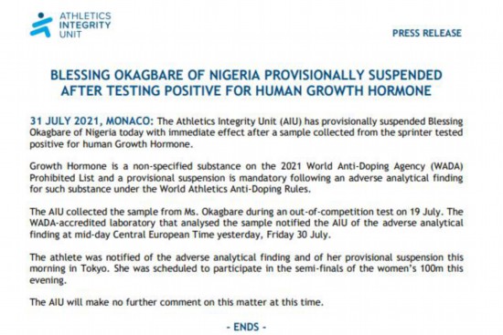 据声明称,于7月30日赢得女子100米预赛第一名的尼日利亚女短跑运动员布莱森·奥卡巴雷于7月19日提交的检测样本的生长激素检测结果呈阳性,因此对其发出停赛通知。