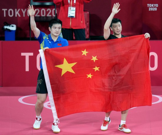 7月30日,马龙(右)和樊振东在比赛后共展国旗。新华社记者 王毓国 摄