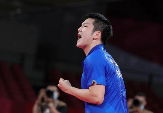 7月30日,樊振东在比赛中庆祝得分。新华社记者 王东震 摄