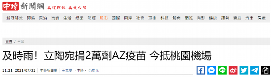 【环球网报道 记者 康博浩】据台湾中时新闻网等台媒消息,台湾部分县市最近又陷入无疫苗可打的处境,台湾地区疫情指挥官陈时中也称“供货有点紧”,立陶宛承诺捐赠的2万剂AZ(阿斯利康)疫苗,由土耳其航空运送,今天(31日)上午抵达桃园机场。对此,有岛内民众表示,“到处都是乞讨来的疫苗,自己买的呢?”,也有网友讽刺,2万剂?是我搞错台湾人口还是你少打三个零?