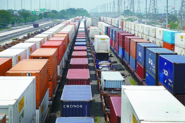当地时间28日,大批集装箱堆在美国伊利诺伊州芝加哥市一个铁路堆场,造成当地商品供应进一步紧张。