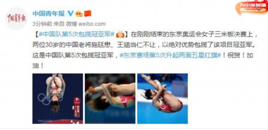 在刚刚结束的东京奥运会女子三米板决赛上,两位30岁的中国老将施廷懋、王涵当仁不让,以绝对优势包揽了该项目冠亚军。这是中国队第5次包揽冠亚军,东京赛场第5次升起两面五星红旗!祝贺!加油!