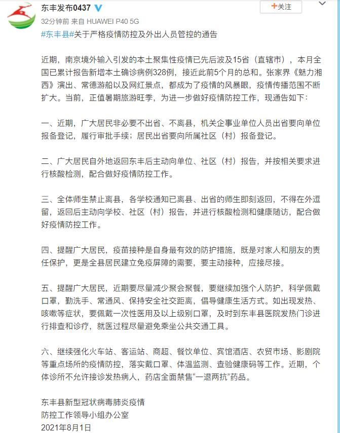 荔枝新闻讯 据吉林省东丰县互联网信息中心官方微博消息,8月1日,东丰县新型冠状病毒肺炎疫情防控工作领导小组办公室发布关于严格疫情防控及外出人员管控的通告。全文如下: