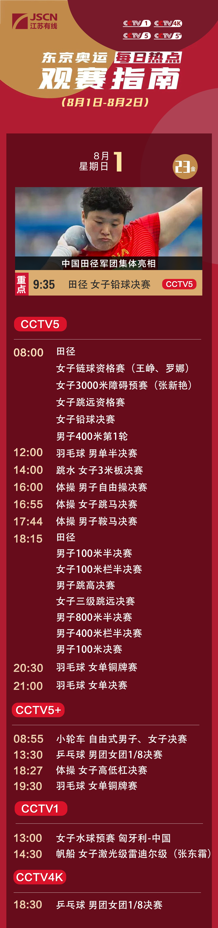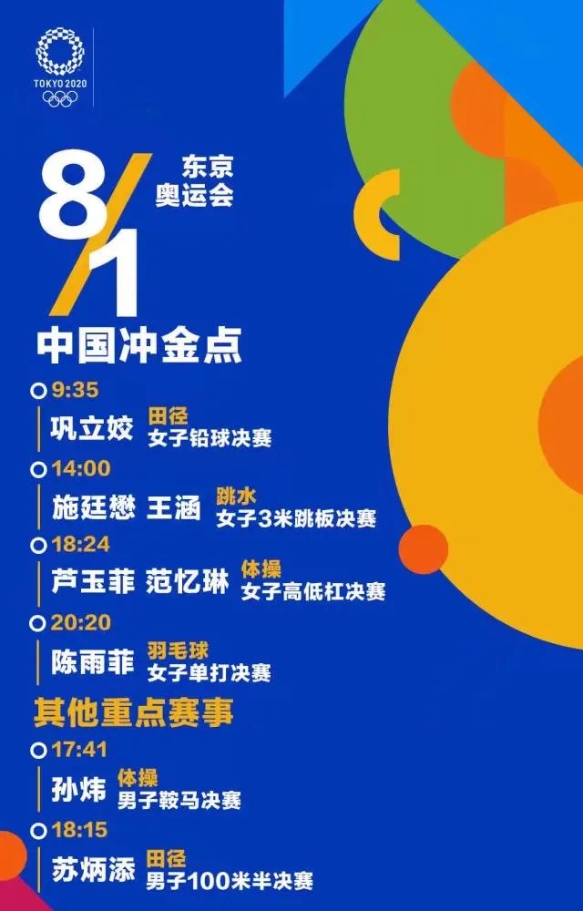田径赛场8月1日将产生4枚金牌,包括引人注目的女子铅球、男子100米两枚金牌。中国田径队本届奥运会的目标是金牌数超越里约奥运会(2枚),巩立姣则是第一个夺金点,也是最稳的夺金点之一。