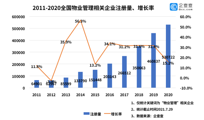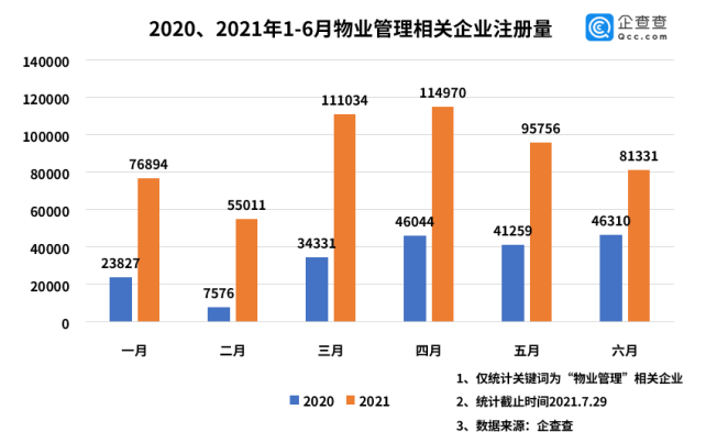 企查查数据显示,2020年上半年,全国共注册19.9万家物业管理相关企业,今年上半年共注册53.5万家,同比增长168.8%。在1-6月中,所有月份的注册量均远大于去年。