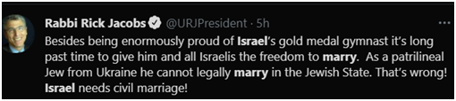 “除了称赞这位以色列自由体操金牌得主之外,早就应该给他和所有以色列人结婚的自由了... 以色列需要世俗婚姻!”