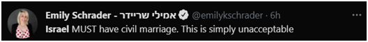 “以色列必须有世俗婚姻。那就是不可接受的。”