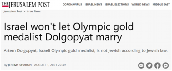 【环球网报道】“以色列不会让奥运金牌得主多尔戈皮亚特(在国内)结婚。”《耶路撒冷邮报》1日一篇报道讲述了该国自由体操选手、金牌获得者阿尔特姆·多尔戈皮亚特的“烦恼”。