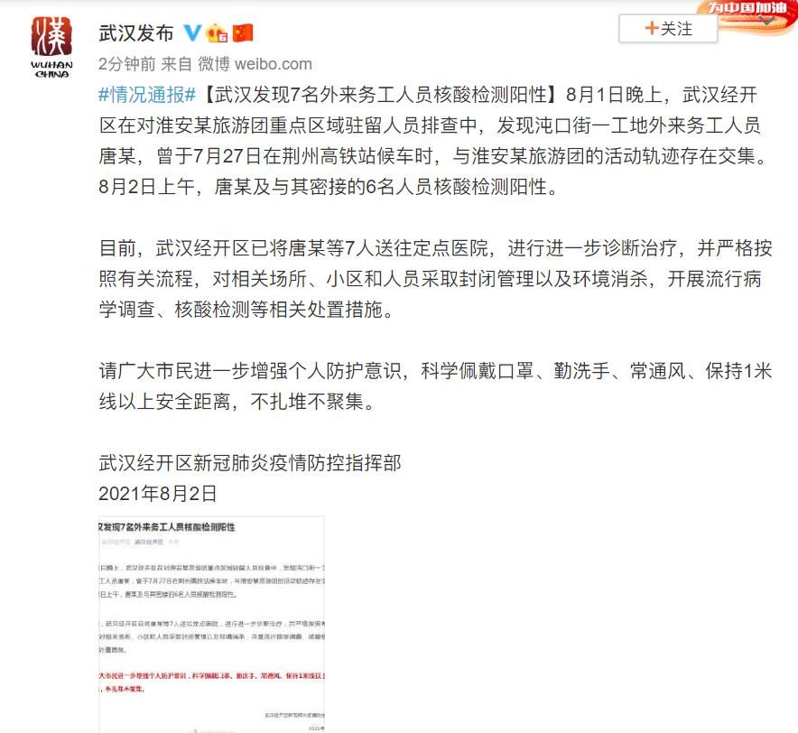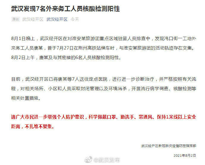荔枝新闻讯 据@武汉发布 微博消息,8月1日晚上,武汉经开区在对淮安某旅游团重点区域驻留人员排查中,发现沌口街一工地外来务工人员唐某,曾于7月27日在荆州高铁站候车时,与淮安某旅游团的活动轨迹存在交集。8月2日上午,唐某及与其密接的6名人员核酸检测阳性。