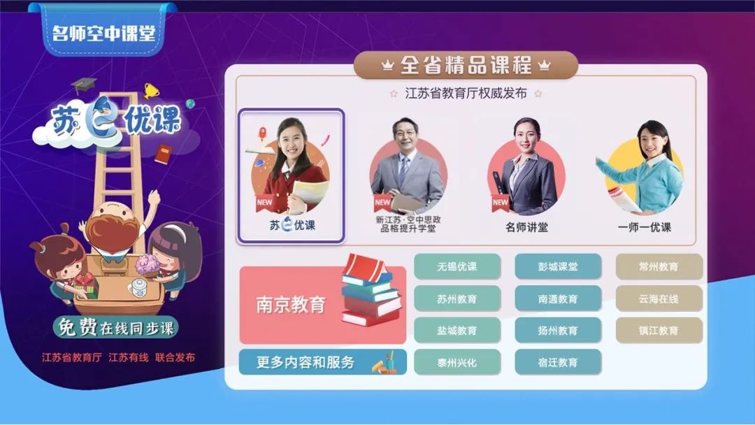 “苏e优课”,江苏省教育厅权威发布,江苏有线大屏独家放送。具有五大特点:新教材、新课程、全名师、全学科、全免费。从小学一年级到高中三年级各门课程随心选择,不用出门补课,名师免费到家。
