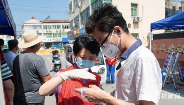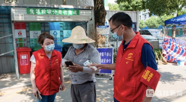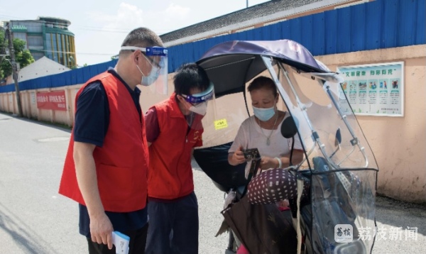 “请出示健康码,测量体温”,7月31日,烈日炎炎,在地表温度为42.4℃的南京市江宁区横溪街道陶吴社区,南京晓庄学院教师教育学院党委书记张洁认真地检查每位进入小区的居民。她工作的关卡点在王家园、陶茂小区,这里住户多、商户多,人流、车流量特别大,此时她已经连续工作近8小时,不间断的工作使她志愿服务的红马甲被汗水浸透,“口罩和防护面罩让我们说话必须得用力,但是基层服务一刻不能耽误!”张洁说。