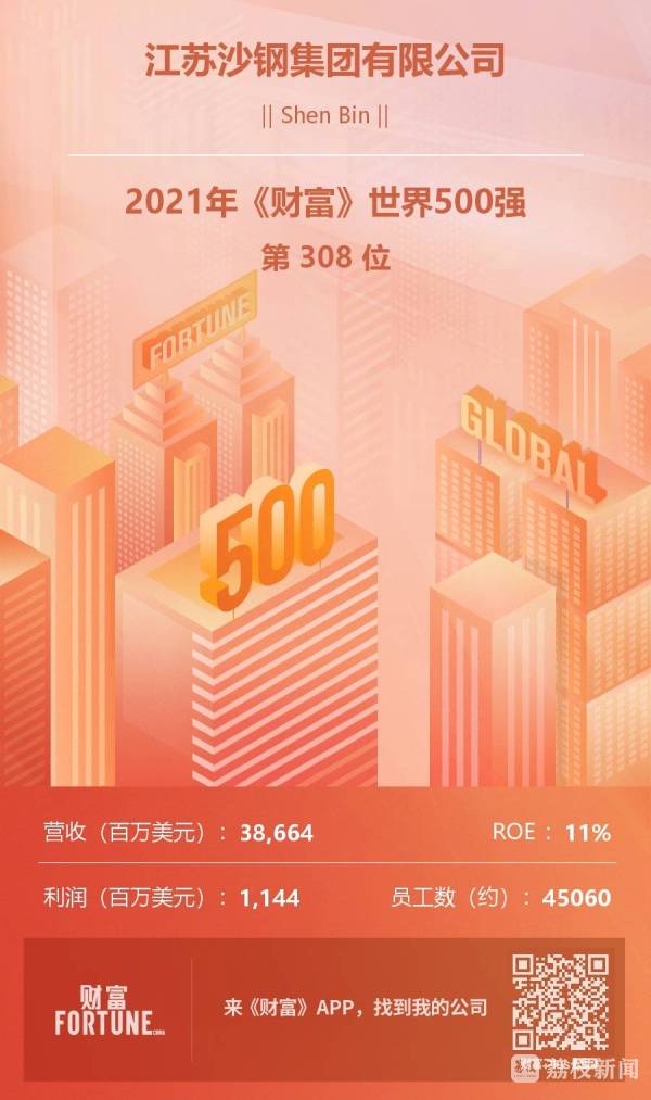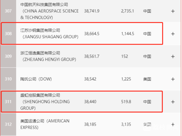 此外,去年排名第351位的江苏沙钢集团有限公司今年位列第308位;去年排名第455位的盛虹控股集团有限公司今年排名第311位。