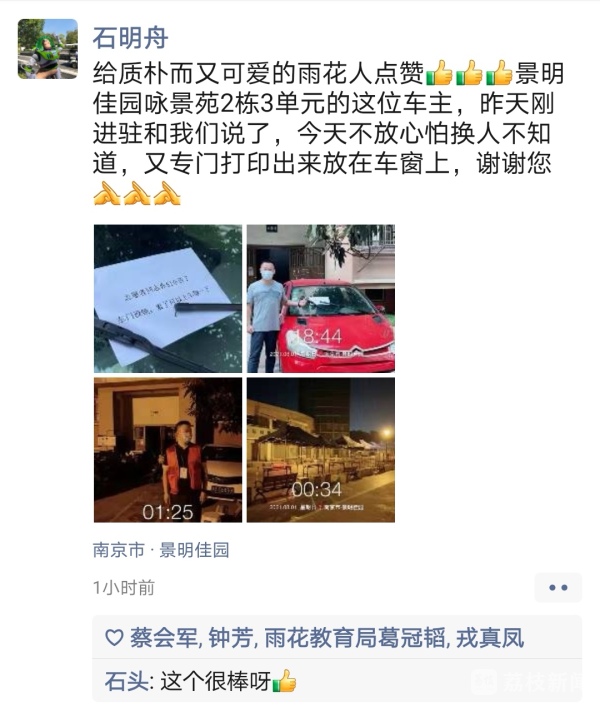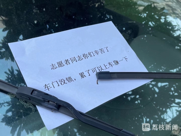 “志愿者同志你们辛苦了,车门没锁,累了可以上车靠一下。”在南京雨花景明佳园咏景苑2栋3单元的门前,一辆红色私家车上的一张纸条格外引人注目,字里行间透露着满满的温馨与感动。区级机关下沉一线的防疫工作人员石明舟在休息间隙伸出大拇指为车主点赞,并在朋友圈上分享了这一幕暖心瞬间。在疫情防控特殊的时期,让忙碌又疲惫的一线工作者内心充满力量。