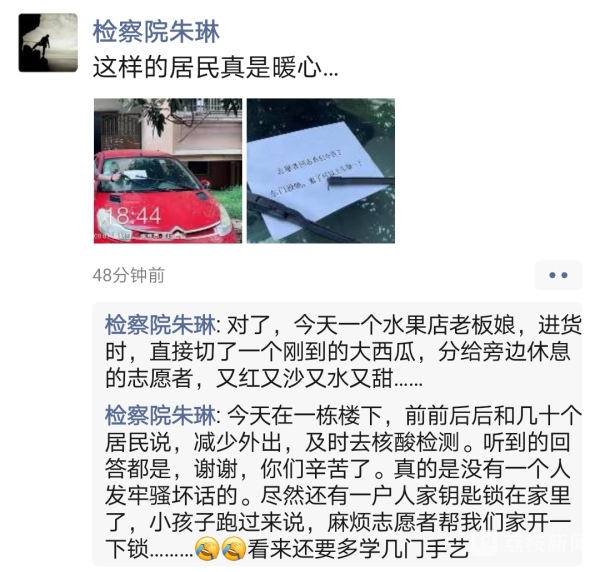 随着疫情防控工作的开展,居民也越来越体会到工作人员的辛苦,用不同的方式帮助和支持社区的防控工作,为他们加油鼓劲。为防疫人员送来冰水、西瓜等解暑降温,楼栋里传来的声音更多的是一句“您辛苦了”,居民网格群内的点赞画面被无限刷屏。一件件小事,体现出人民群众对防疫工作者的关心、支持和理解,温暖了广大工作者的心田。