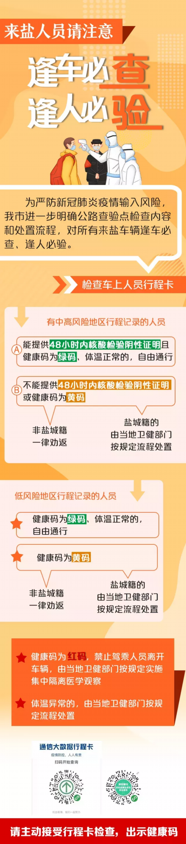 请广大驾乘人员途经查验点时,提前减速慢行、打开车窗、戴好口罩,服从现场指挥,积极配合查验工作。