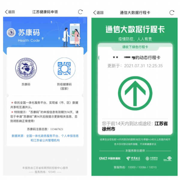 “健康码”和“行程码”是在徐、来徐人员进出小区(村)、单位、企业、学校、医院、车站、机场和其他公共场所及乘坐公共交通工具等的健康通行凭证。为避免对您的行程造成不必要的影响,请您提前注册、领取“两码”,配合工作人员开展查验工作。您的理解和支持将有助于更好地筑牢疫情防输入防线。