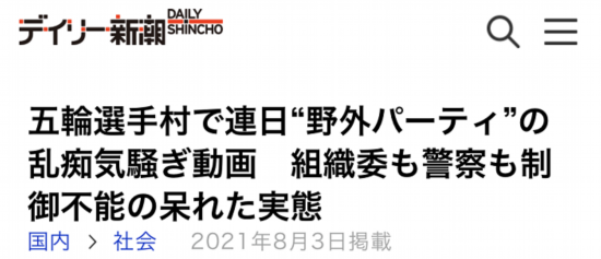 《日刊新潮》称,多家日媒已经针对奥运村内运动员聚众饮酒一事进行过报道,但匿名奥运相关人士气愤地对《日刊新潮》说,日媒的报道没有将奥运村的现状正确地传达给日本民众。