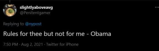 因此,有网友讽刺说:“规则是为你们(制定的),而不是为我—— 奥巴马”