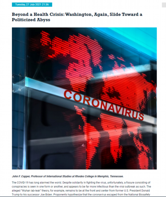 “尽管全球在抗击新冠病毒方面团结一致,但不幸的是,阴谋论的裂缝正以各种形式层出不穷,而且似乎比暴发的病毒更具传染性”,美国罗德学院国际关系学教授约翰·库珀近日撰文批评被一些西方政客和媒体频繁炒作的“实验室泄露论”。库珀在文章中表示,政治化是这一切的幕后操纵。