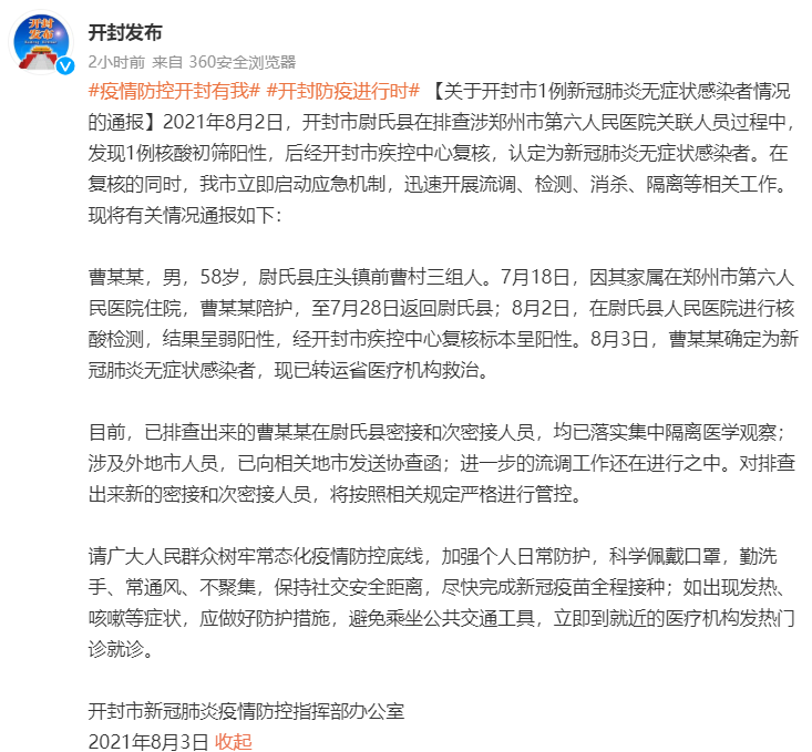 荔枝新闻讯 据“开封发布”微博消息,2021年8月2日,河南开封市尉氏县在排查涉郑州市第六人民医院关联人员过程中,发现1例核酸初筛阳性,后经开封市疾控中心复核,认定为新冠肺炎无症状感染者。在复核的同时,开封市立即启动应急机制,迅速开展流调、检测、消杀、隔离等相关工作。现将有关情况通报如下: