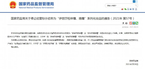 为保障公众用妆安全,净化化妆品市场,依据《化妆品监督管理条例》,国家药监局要求各省(区、市)药品监督管理部门责令相关化妆品经营者立即停止经营标示生产商为“台湾宜兰市康乐路132、135号”的“伊丽莎柏早霜”及“伊丽莎柏晚霜”化妆品,发现违法行为的,依法严肃查处;涉嫌犯罪的,依法移送公安机关。