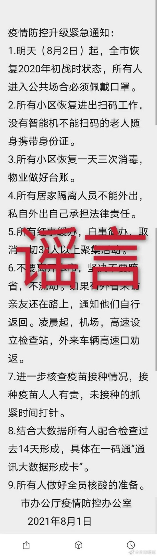荔枝新闻讯 据“天津辟谣”微博消息,近日,有网民在群圈内传播涉我市疫情防控升级信息,经与有关部门核实,相关消息为不实信息。请广大网民朋友及时关注权威信息,不信谣,不传谣,不造谣,共同营造清朗网络环境。