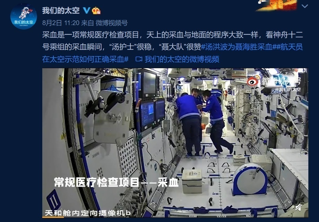 8月2日,微博账号“我们的太空”发布一段神舟十二号航天员们在空间站采血的视频,并配文称,“采血是一项常规医疗检查项目,天上的采血与地面的程序大致一样,看神舟十二号乘组的采血瞬间,‘汤护士’很稳,‘聂大队’很赞。”