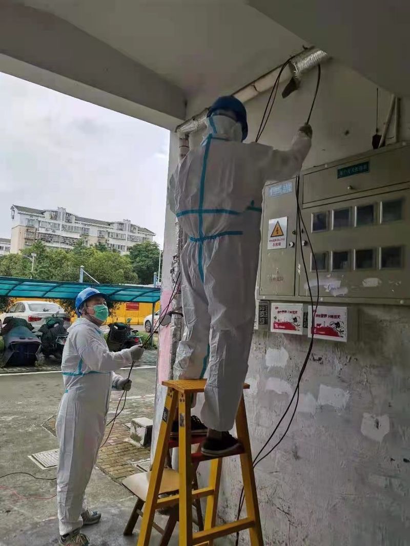 一小时后, 120米照明线、2盏应急照明灯敷设安装大功告成,小区出入口值守人员用上电吹上了空调。