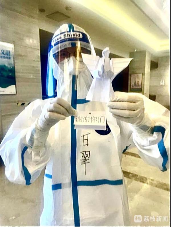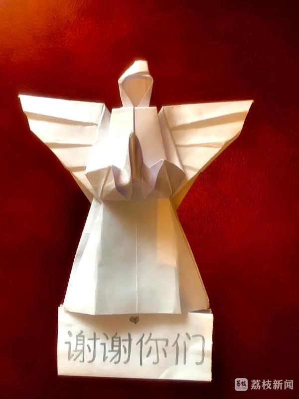 这是南京市江宁区一处防疫集中隔离点内,一位被隔离的大学生送给上门采集核酸的甘翠医生的小礼物,是一只插着翅膀的折纸天使。收到这份突然而来的特殊礼物,甘医生回到生活区已抑制不住内心的激动,“吃再多的辛苦都值,我也要谢谢这些被隔离的人员,更要感谢你们工作组为我们创造了安全的工作环境和舒适的生活环境,愿大家都平平安安!”